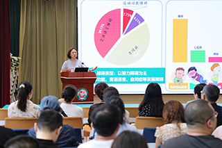 10:00,交流活动正式进入核心环节。在多功能室,叶朝晖校长首先致欢迎辞,对上海市盲童学校一行的到来表示热烈欢迎。随后,她围绕“学校简介”“健康第一、因材施教”“任务驱动、精准支持——双新背景下培智学校教学方式变革的探索实践”三个方面作主题报告,详细介绍了董李凤美康健学校的办学理念、教育模式及在教学变革中的探索与实践,为来宾们呈现了一幅培智教育创新发展的生动画卷。